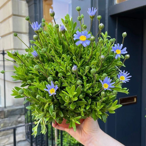 The daisy like flowers of this plant have a mix of purple and blue in their hue, that leans on the latter shade as the blooms mature. It needs good sunlight exposure to blossom well.